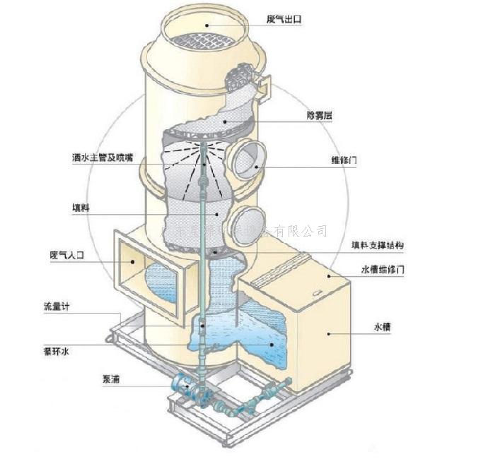 工業(yè)廢氣由風(fēng)管引入噴淋水塔,經(jīng)過填料層,廢氣與水及藥劑進(jìn)行充分的氣液接觸,廢氣經(jīng)過物理吸附及化學(xué)反應(yīng)后,再經(jīng)除霧板脫水除霧后由風(fēng)機(jī)排入大氣。