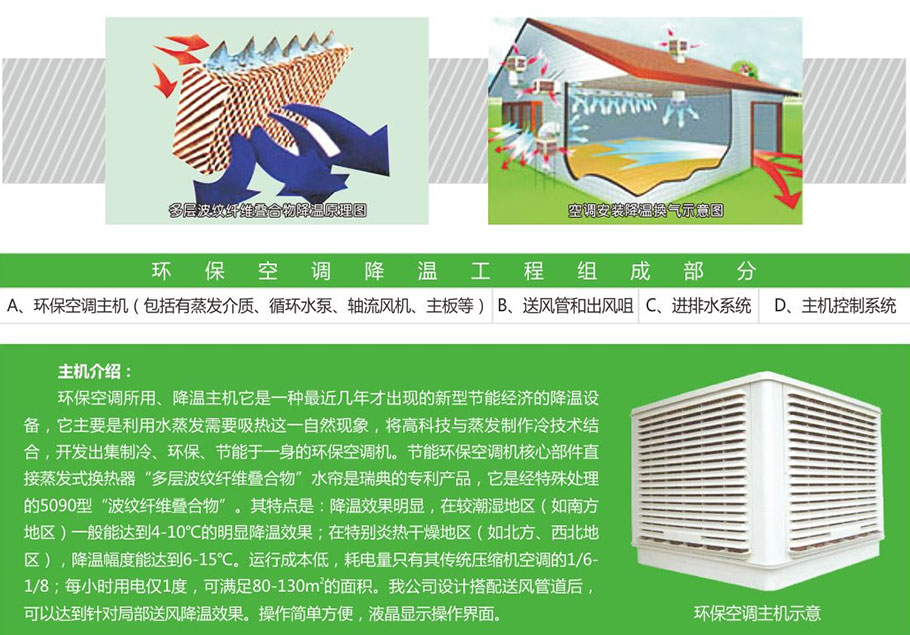 系統(tǒng)工作原理:環(huán)??照{又名:水空調,它之所以節(jié)能是因為利用了水蒸發(fā)需要吸收熱量這一自然現(xiàn)象。